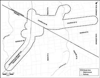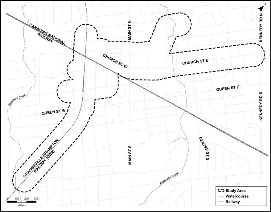 - Package 1 study area: Centre Street North, north of Woodway Avenue, west through Duggan Park to Ken Whillans Drive, south along Ken Whillans Drive, and west along Alexander Street/Market Street to Church Street West at Mill Street/Market Street/Church Street junction.