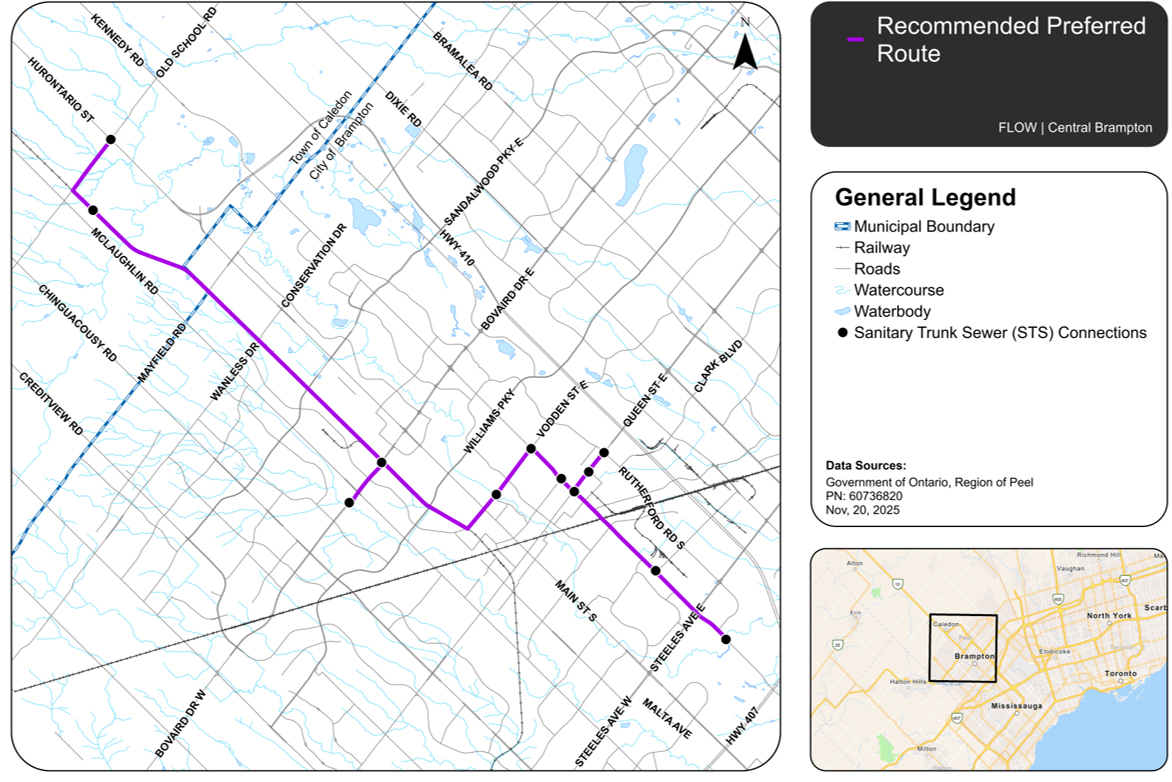 Flow | Central Brampton will meet these demands by combining more than 30 water and wastewater projects into one large-scale construction program across Brampton, including the Schedule C Municipal Class Environmental Assessment (MCEA) Study for the Kennedy Road Sanitary Trunk Sewer Project. This Project will help ensure sewage capacity requirements are met by 2051 to support growth in Peel Region. Refer to Figure 1 for Project Study area, including the recommended preferred route.