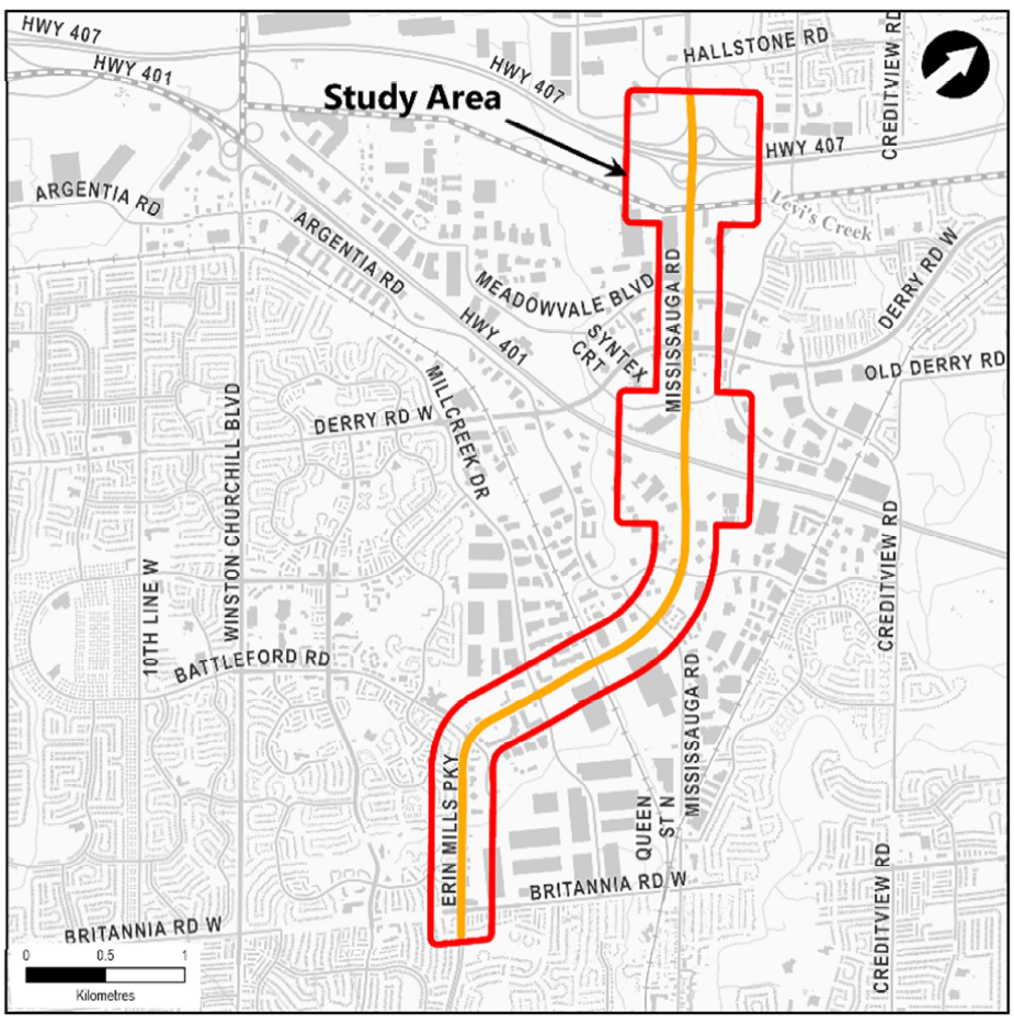 Peel Region is undertaking a complete corridor study to improve Erin Mills Parkway between Britannia Road and Highway 407 (Figure 1) within the City of Mississauga and City of Brampton. The objective is to transform this key goods-movement corridor into a “Complete Corridor” that prioritizes safety and promotes efficient movement, while integrating all modes of transportation including walking, cycling, transit, auto, goods movement, and maintaining a state of good repair through infrastructure renewal.