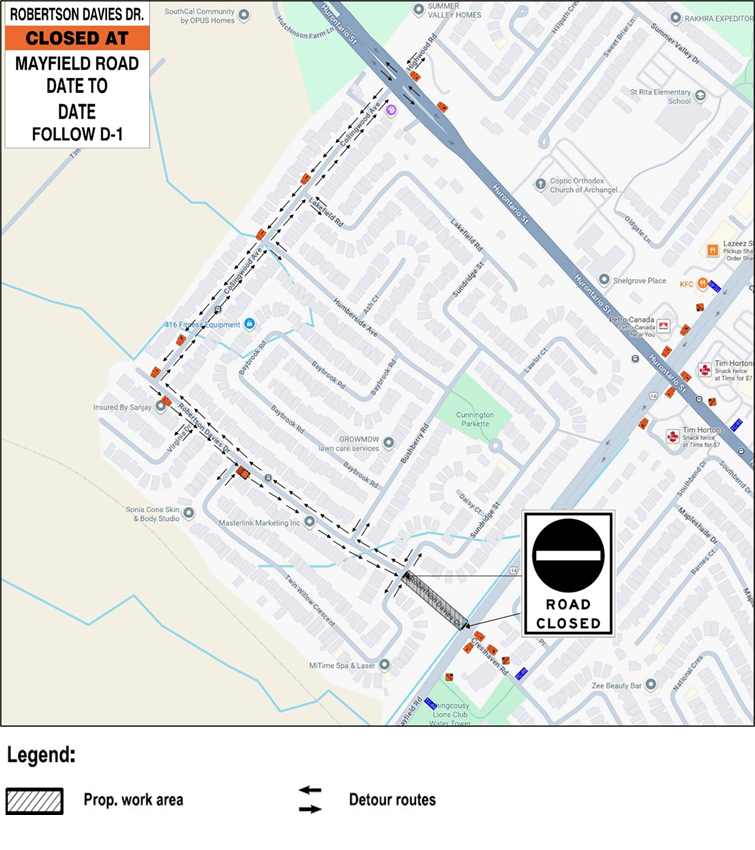 This notice is to notify residents of the temporary road closure on Robertson Davies Drive at Mayfield Road, due to required construction in the area.