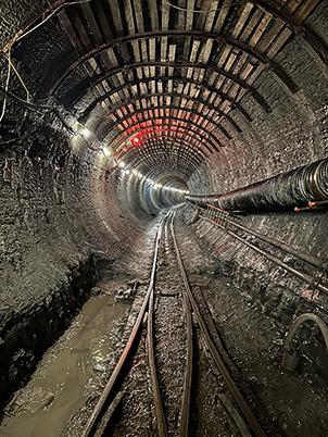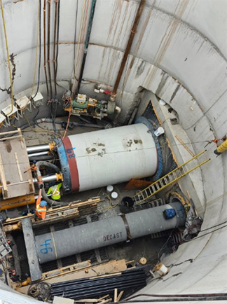 Inside a tunnel shaft at Dixie Road north of Williams Parkway. Two different-sized watermain pipes are being installed.