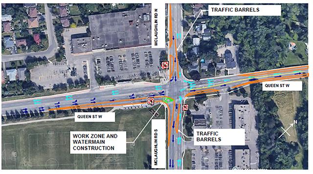 The intersection of Queen Street West and McLaughlin Road will have lane reductions in all directions. Expect delays and choose alternative routes if possible.