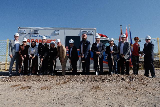 Paramedic Chief Brian Gibson, Peel Region Chair Nando Iannicca, councillors and others gathered today at the construction site near Dixie and Docksteader Roads to mark the occasion and break ground on the new facility.